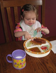 Look at me sitting at the table like a big girl. I don’t even use a sippy cup anymore. Here I am enjoying a yummy Chinese food smorgasbord. Mommy made orange chicken, rice and ginger carrots. YUM!
